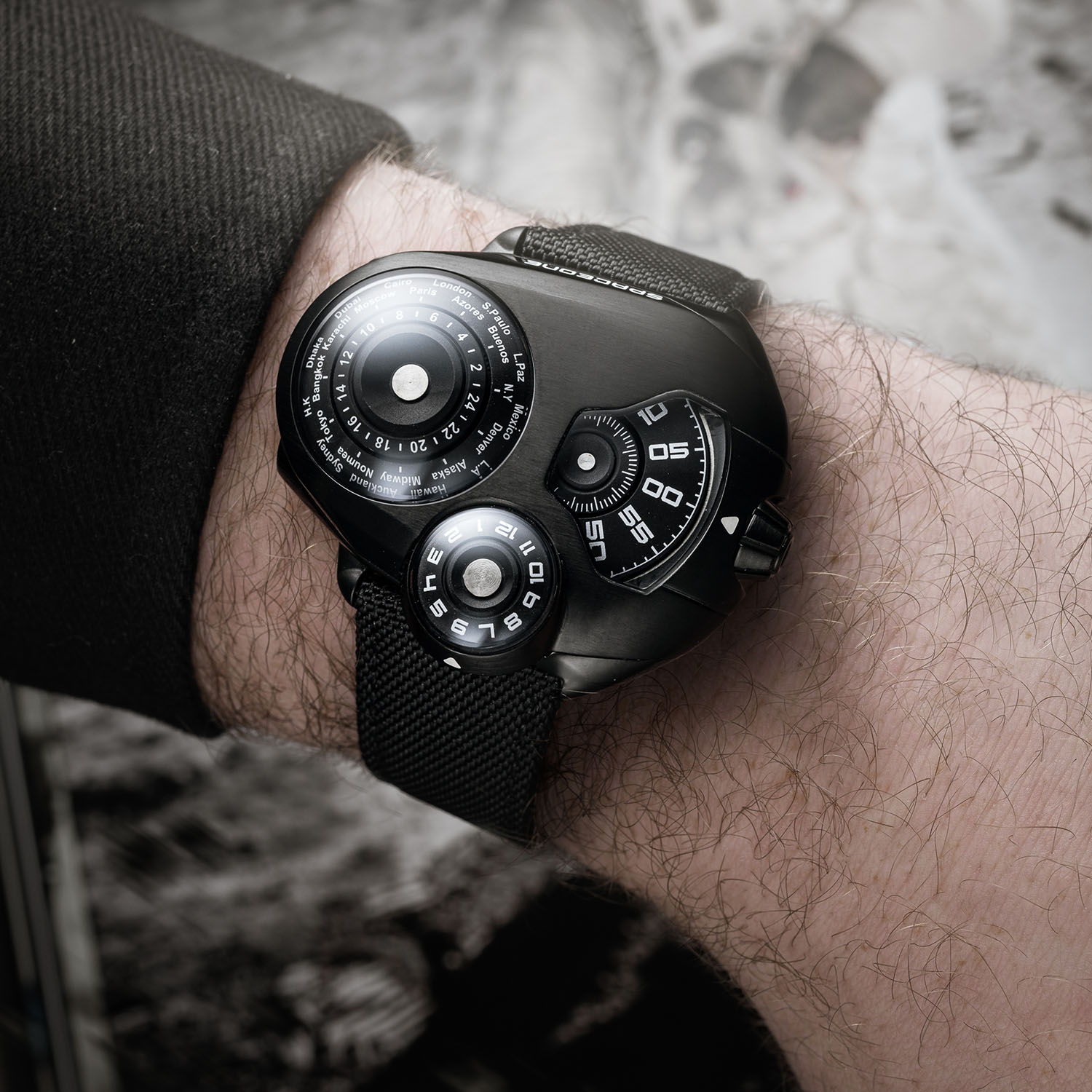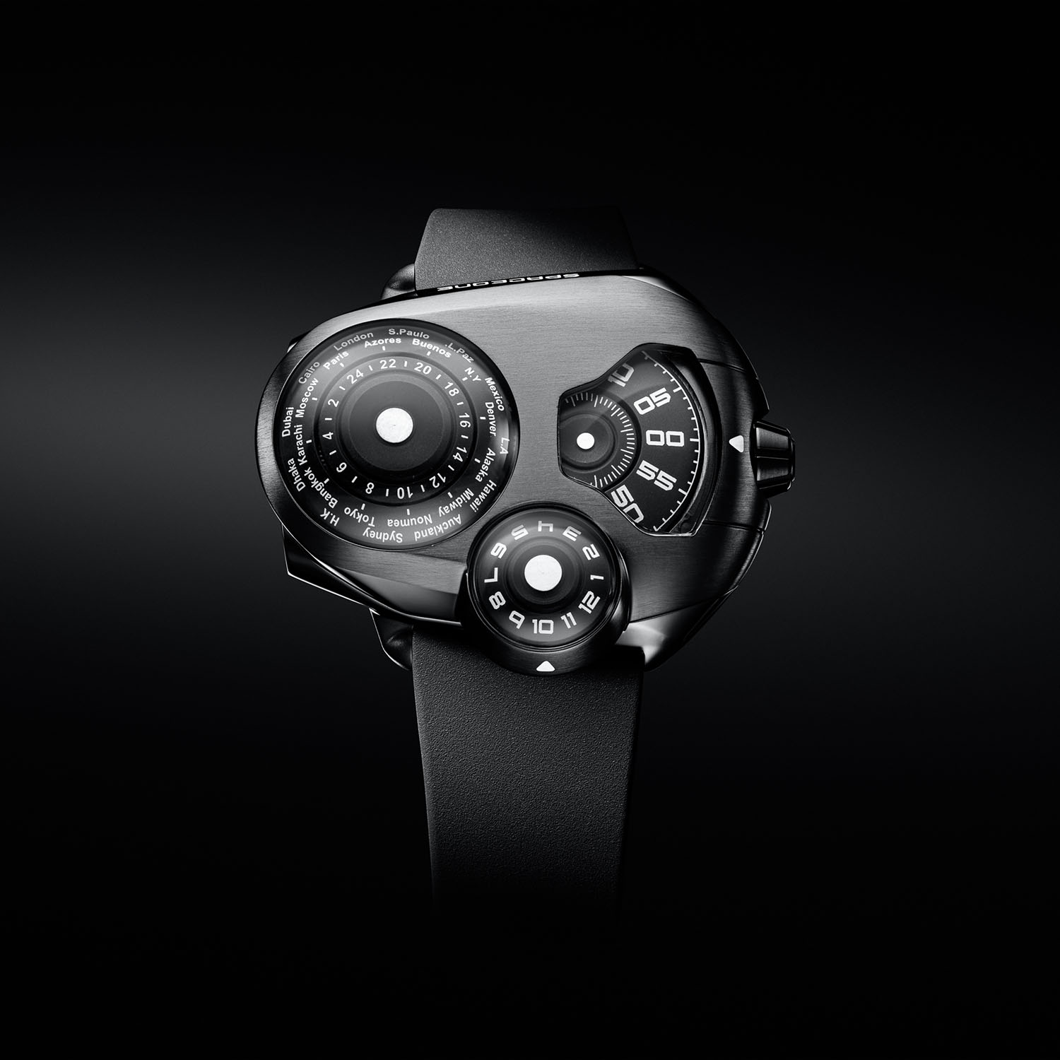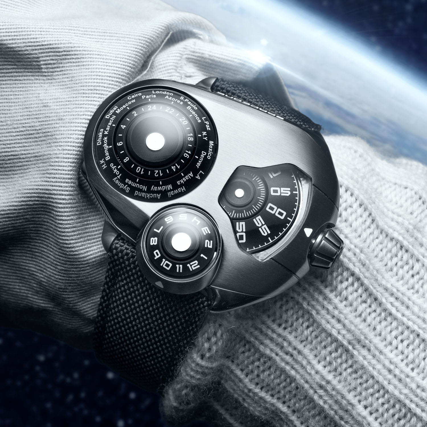 The SpaceOne WorldTimer case is made from lightweight Grade 5 titanium, featuring a combination of polished, brushed, and sandblasted finishes that highlight its striking, unusual form. It is available in three editions: classic, uncoated titanium, and two PVD-coated versions in black or blue. The case is large yet remains fairly wearable, at 52.7mm in width including the crown and 15.88mm thick (including sapphire domes), but only 41.9mm in length thanks to its ergonomic shape and lightweight titanium construction. Twin sapphire domes, one over the dual city/24-hour display and another over the hour disc, create dimensionality. Water-resistance is 30 metres, 30 times more than enough for spatial exploration.