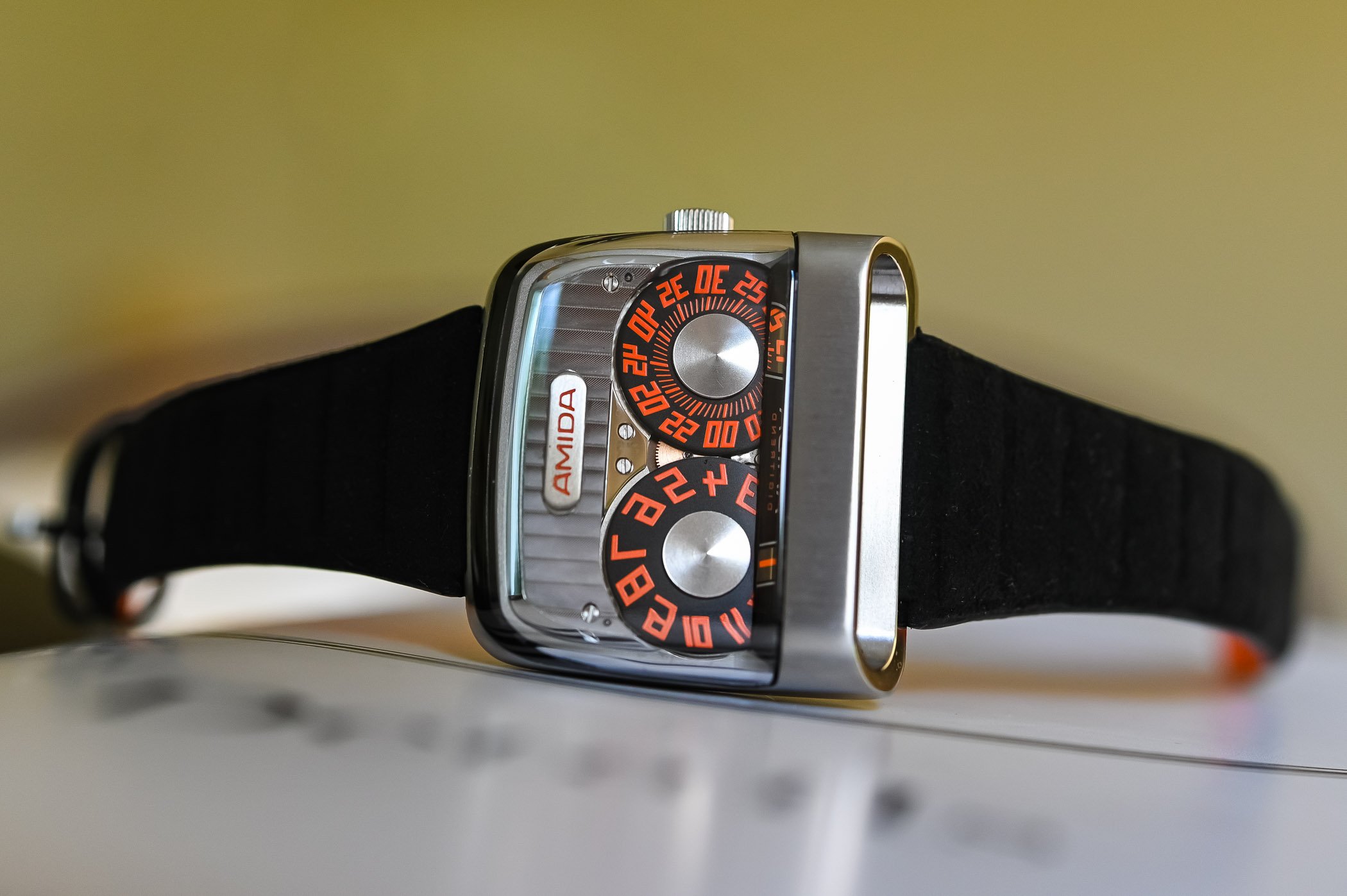 The Amida Digitrend movement is based on a Soprod Newton P092 automatic base calibre, coupled with a proprietary jump-hour module. The flat-layed hour and minute discs are now visible through the watch’s sapphire hood, while time can still be read horizontally through the side sapphire prism that mirrors them. Extra attention has been dedicated to the movement finishing now that it is on full display, with in particular Geneva stripes, anglage and perlage.