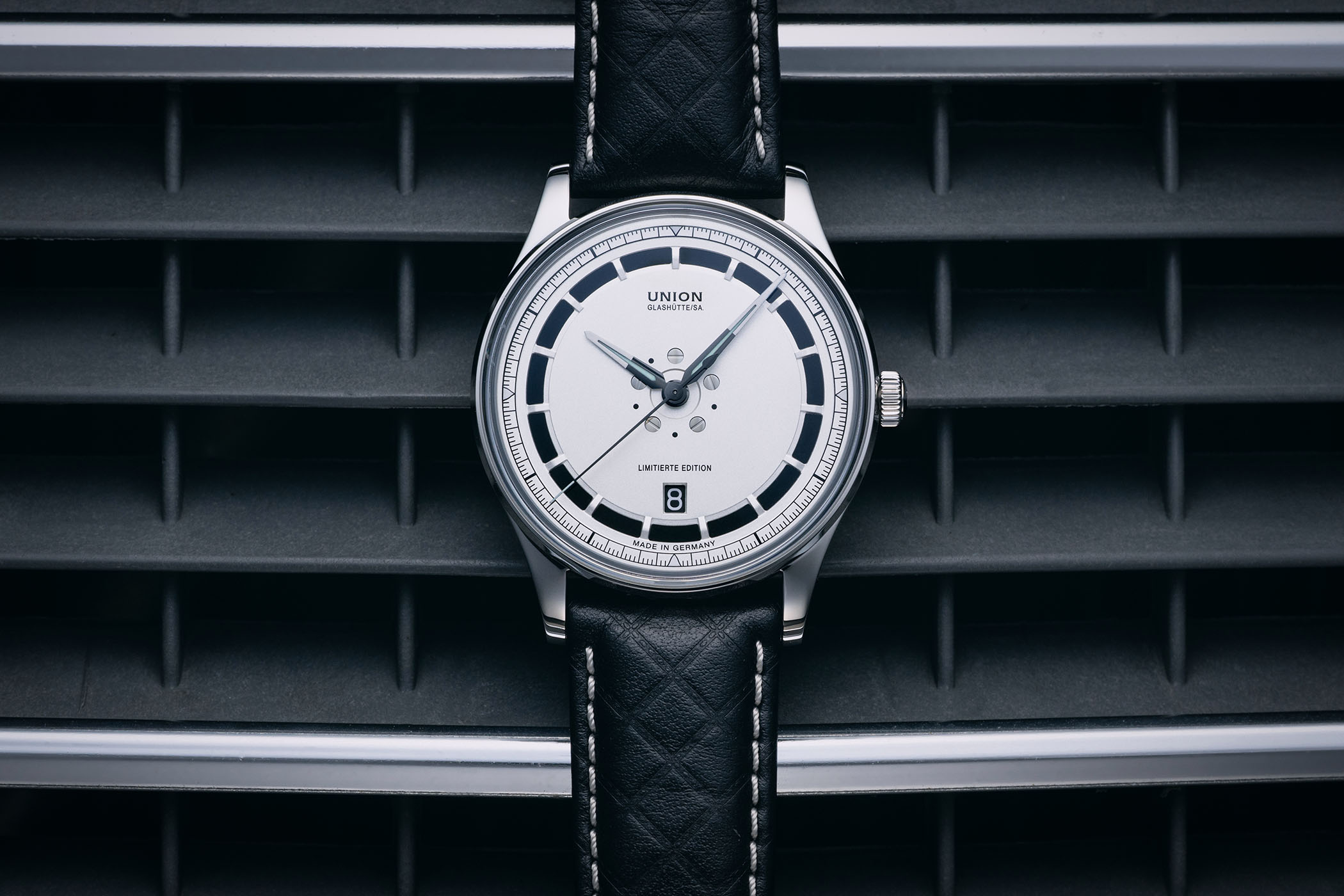 Inside beats Union’s calibre UNG-07.S1, an upgraded version of the ETA 2892. Fitted with a silicon balance spring for improved magnetic resistance and long-term stability, it operates at 25,200 vibrations/hour, offers a 60-hour power reserve, and has a hacking seconds function. The watch comes fitted with a black calfskin strap featuring contrast stitching and diamond-pattern embossing, reminiscent of vintage sports car seats, adding another bit of retro charm to this automotive-inspired timepiece. It is closed by a folding clasp.