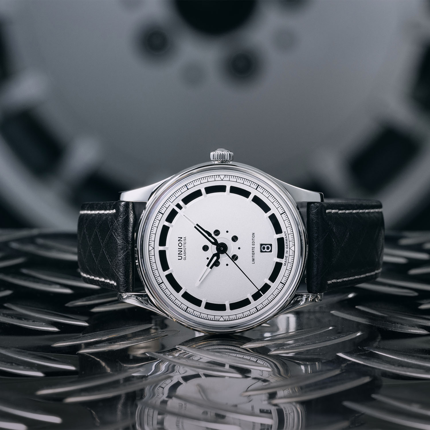 The silver dial replicates the design of the Gullideckel rim with rectangular cutouts around the periphery and five tiny screws at the centre, evoking wheel nuts. A black railway-style minute track rings the dial, and the hands are black, lance-shaped, and tipped with white Super-LumiNova for legibility in low light. A framed date window sits at 6 o’clock, integrated cleanly into the layout – differently placed than the 2024 BBS‐RS rim tribute.