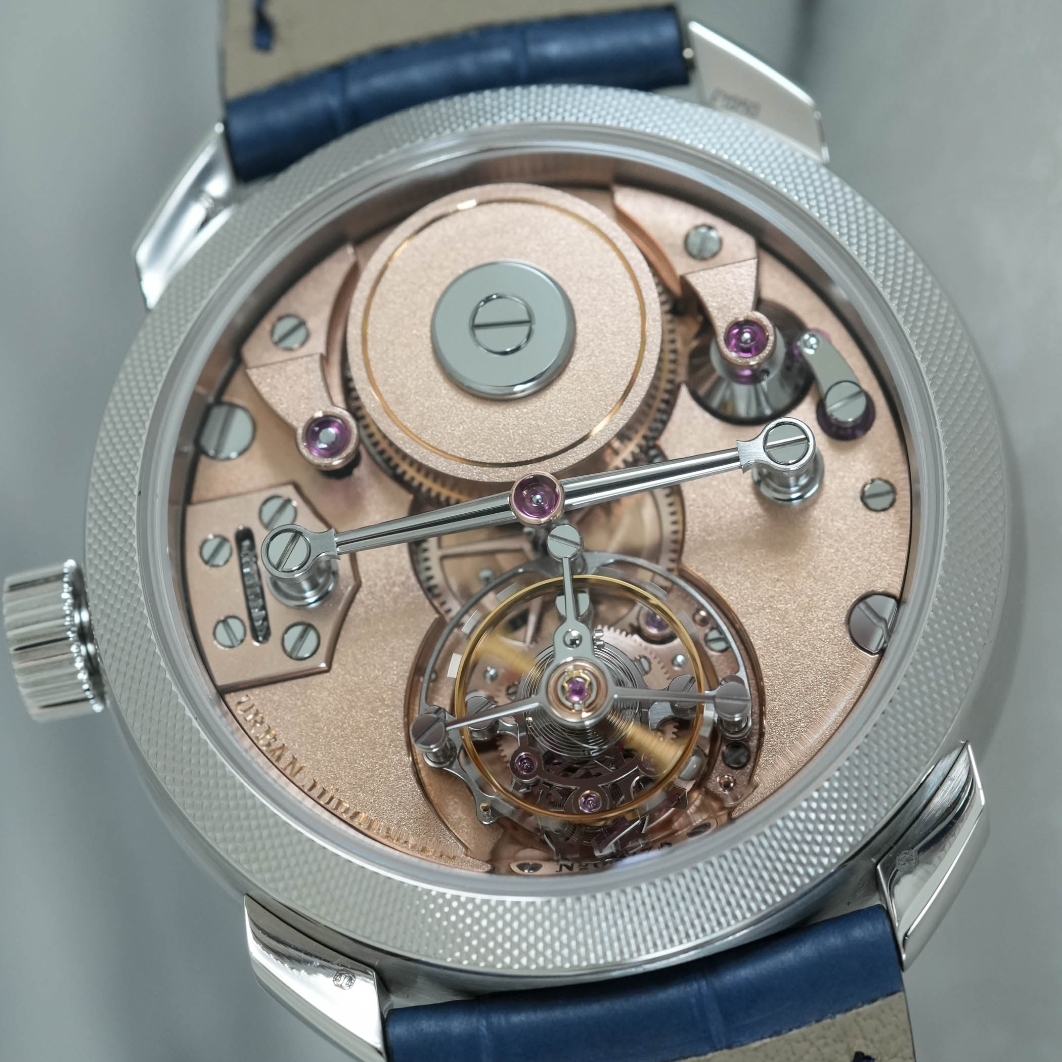 Let’s now move to the main interest here, the movement. While the exterior elements of the watch are discreet, the movement is beautifully demonstrative – what else would you expect from Kari and UJ…? Made in-house and developed by Voutilainen, the calibre UJ-1 miniaturises and adapts a version of the legendary Pratt’s oval pocket watch movement into a wristwatch. This large calibre is built around 3 aligned elements: a flying barrel that seems to float above the movement, a large central bridge with pillars, and the regulating organ… But not any kind of regulator. This UJ-1, just like the oval, has a one-minute tourbillon equipped with a remontoir d’égalité (a constant force device) inside the carriage – the oval was the first movement to be equipped with this. It beats at 18,000 vibrations/hour, and the remontoir delivers the energy to the escapement once per second. This was important for the owners and Voutilainen to bring back the memory of this spectacular watch to the wrist.
