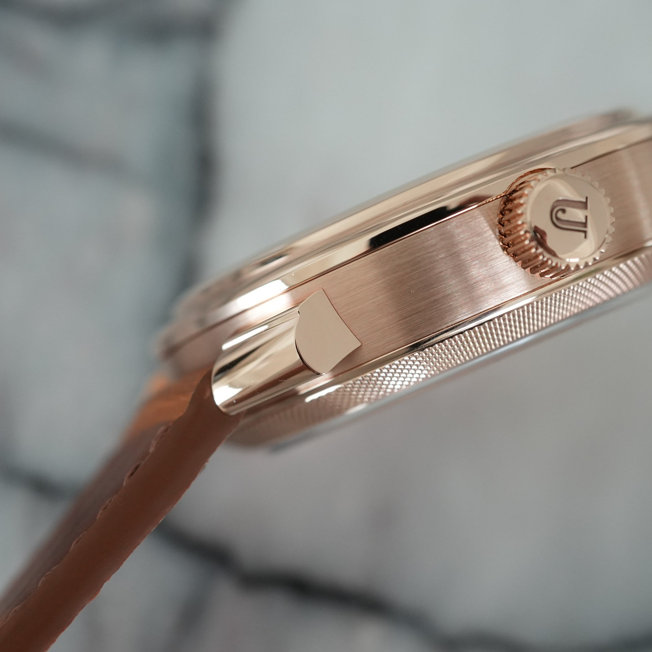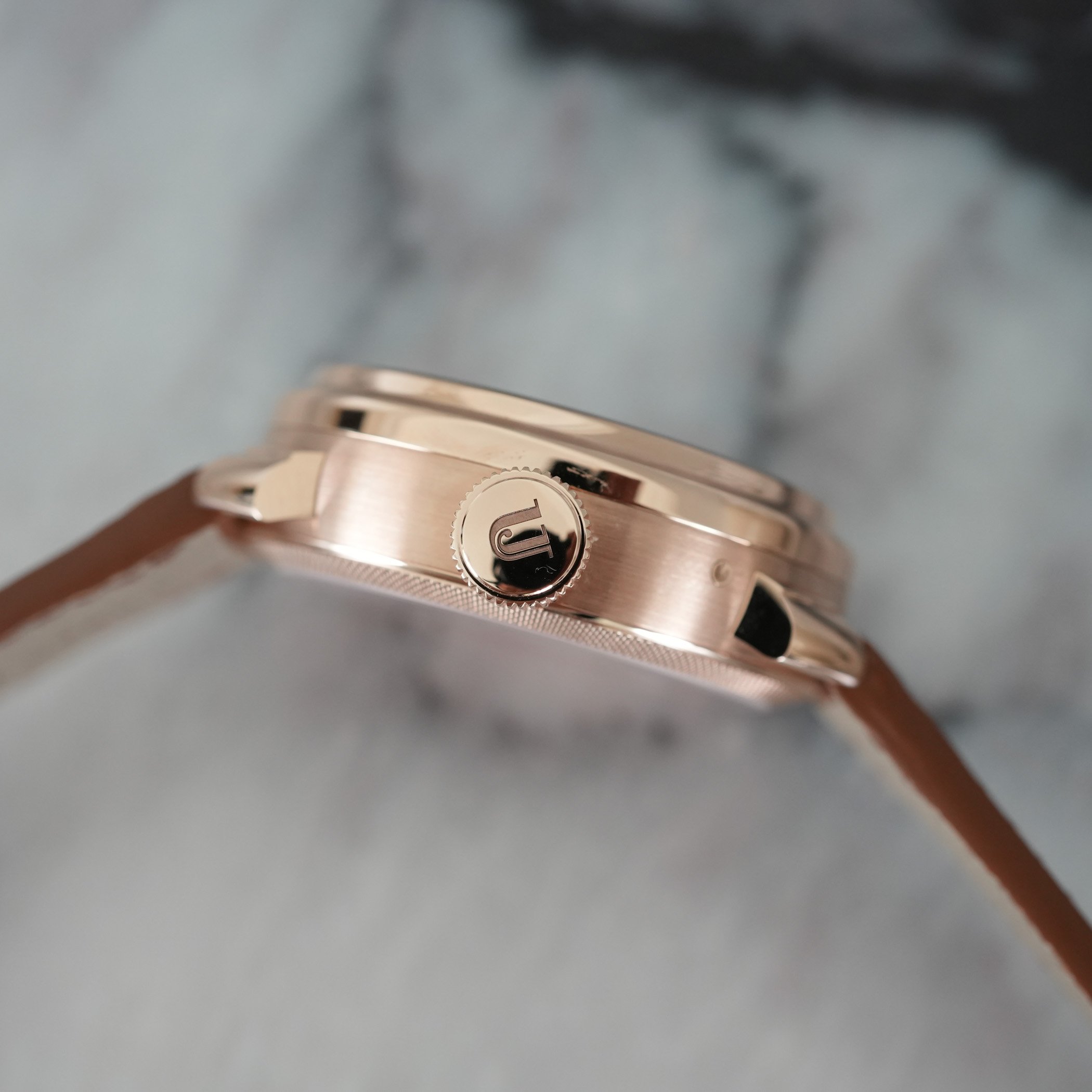The case design is shared with the two aforementioned UJ-1 and UJ-2, only here with more heft due to the presence of a QP complication. The case, available in 950 platinum or 18k rose gold, measures 39mm in diameter but is now 13.9mm in thickness. The reinterpreted teardrop lug, the stepped bezel and guilloche caseback are all identical to the two models above. As for the dial, the only option available for now is a black guilloché silver base, paired with gold hands that match the colour of the case metal.