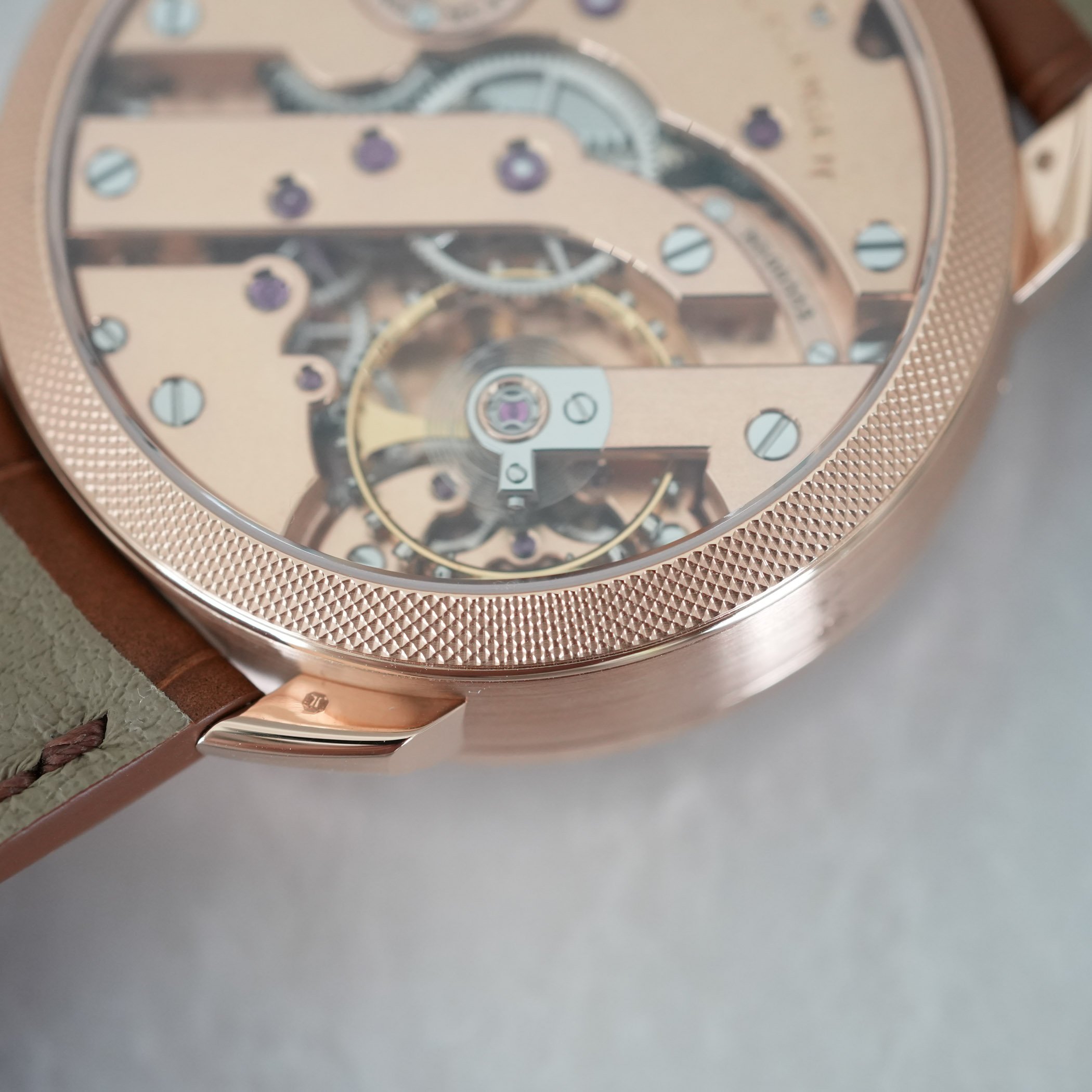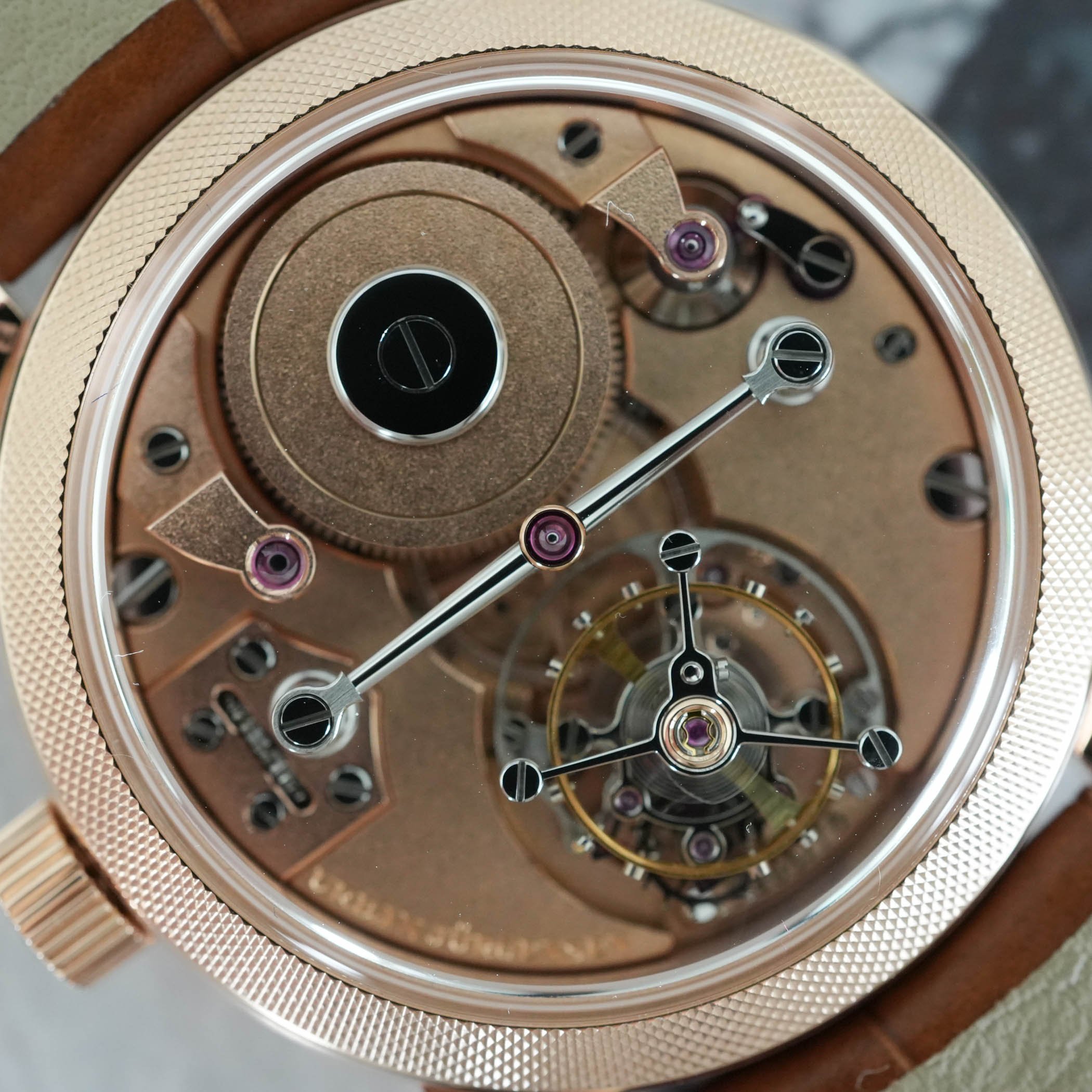 The movement is beautifully finished, yet maybe in a less demonstrative way than what you can see on Kari’s own calibres. The plates and bridges have an antique pocket watch feel, with their grenage surface and a rose gold plating. All elements are dome-bevelled by hand, including the spectacular central bridge with its gold chaton. All wheels are satin-polished with chamfered spokes, and the screw-heads are mirror-polished. The large flying barrel is equipped with a Geneva stop-work and delivers 47h of power reserve. The regulator is a Swiss lever, paired with a balance wheel with micrometric timing screws and hairspring with Phillips terminal curve. And a fine detail, the power reserve indicator is driven by a conical element.