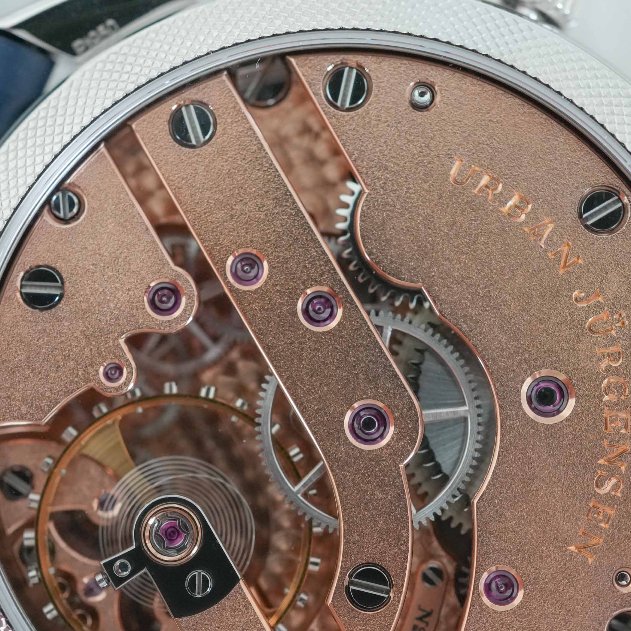 The UJ-2 is in the vein of many recent three-handers by independent watchmakers. Not entirely a dress watch, visually classic yet lavishly finished… with the price to match. It starts with the same overall case design with a stepped bezel and reinterpreted Jürgensen teardrop lugs, only made slightly smaller at 39mm in diameter and 10.9mm in thickness. Again, the lugs are short and should offer great comfort on the wrist, even though the result is a watch that feels a bit wide and tall. Again, the caseback is decorated with a hand-guilloche pattern, circling the sapphire crystal revealing the movement.