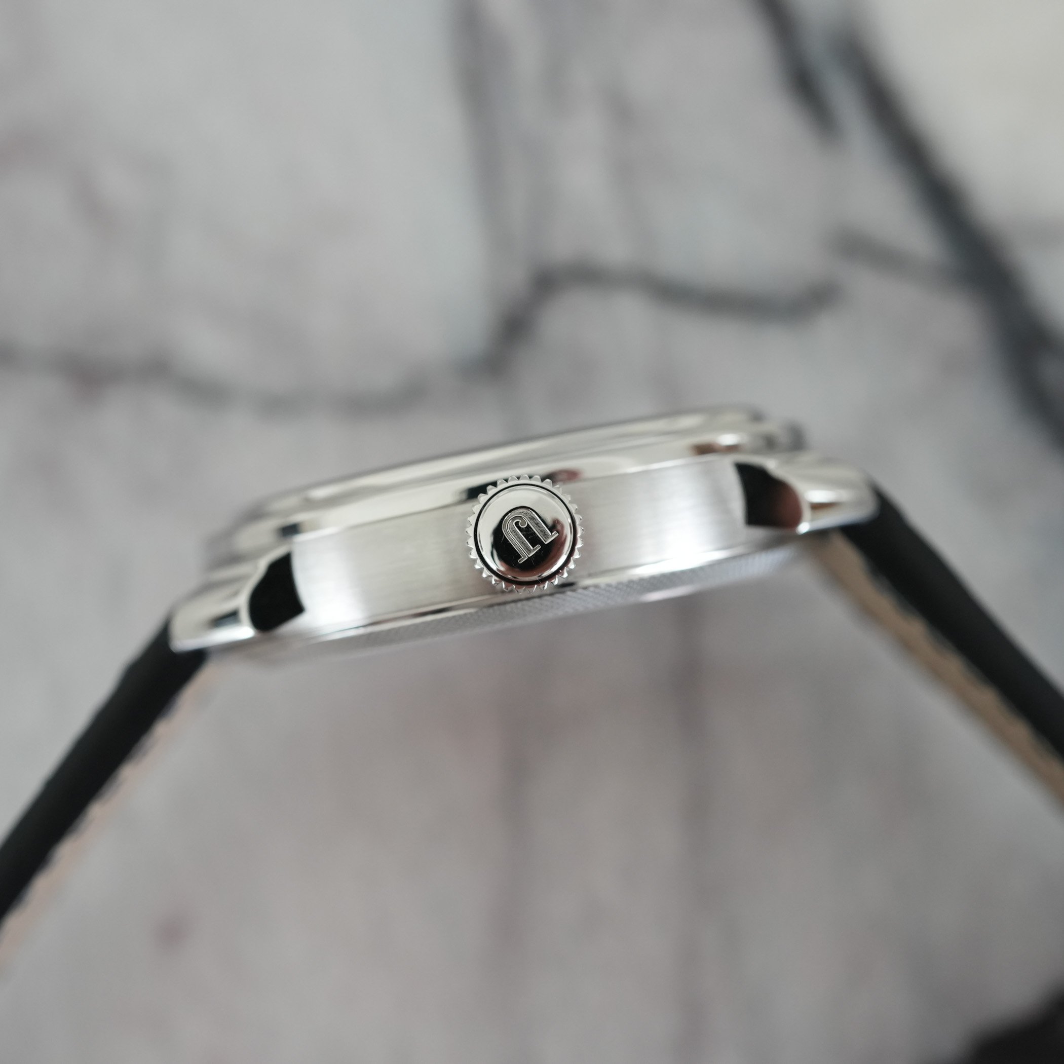 It all starts with a relatively compact case of 39.5mm, with a thickness of 12.2mm. If the lug-to-lug isn’t mentioned, we can clearly expect it to be on the short side, given the shape of the lugs. As said, these are modern reinterpretations of the classic Jürgensen teardrop lug, with a bolder, more graphic shape. The case is equipped with a stepped bezel, featuring both satin-finished and polished elements. The back is finely finished with a grain d’orge hand-guilloche pattern, showing the dedication to fine, even non-visible details.