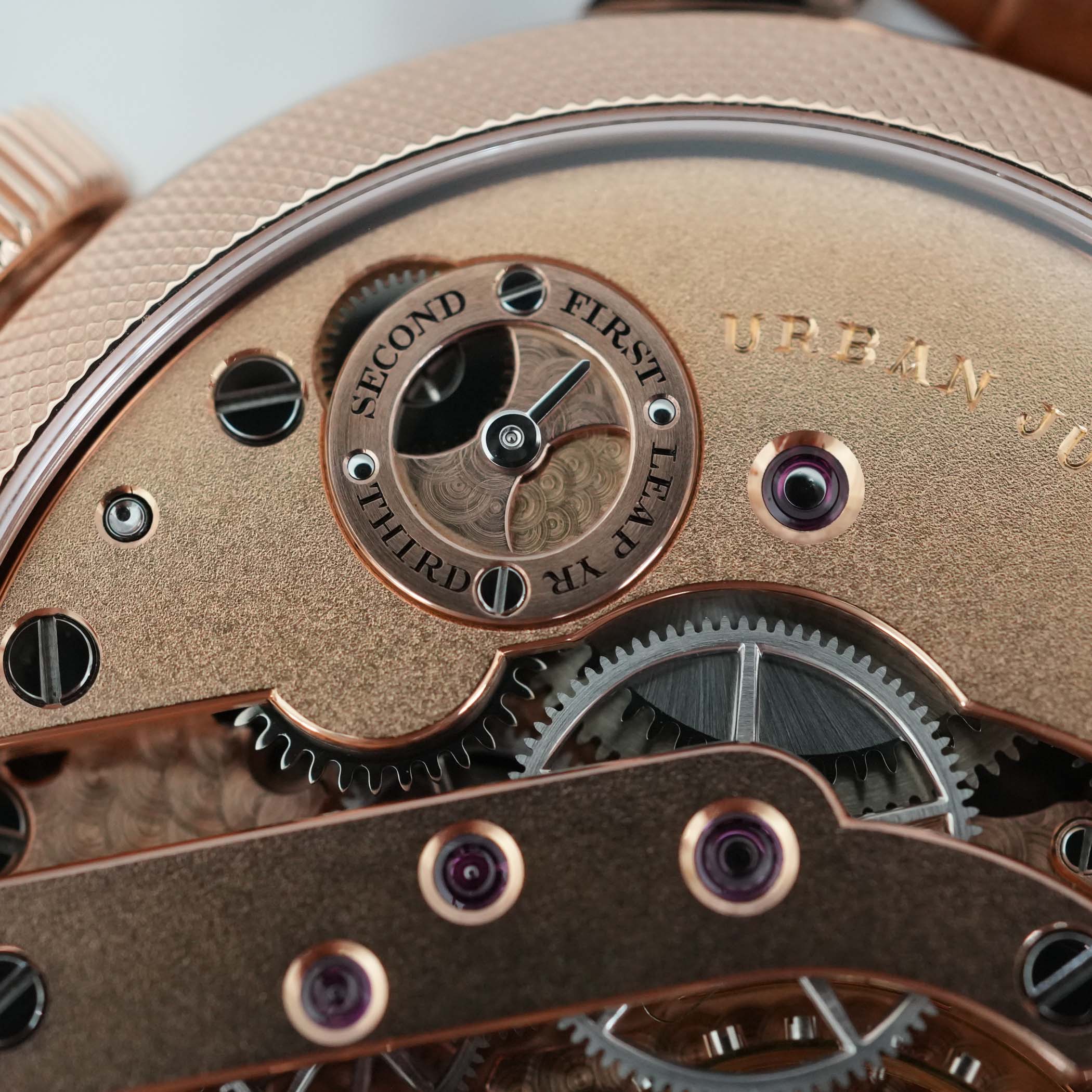 Besides the look and finish, this movement is also distinguished by its use of a complex regulating organ. The large screwed free-sprung balance is connected to a system dear Kari Voutilainen, the double wheel natural escapement. It has been adapted to UJ’s needs in order to create a base movement that can layer complications (more on that in a bit). This escapement was first imagined by Breguet and then rediscovered by friends Daniels and Pratt, the latter incorporating it in a pocket watch movement in the late 1990s. Its significance lies in how it addresses the age-old challenge of reducing friction while achieving the optimal transfer of energy efficiently and precisely within a mechanical watch. This lubrication-free system delivers a direct impulse to the balance through an impulse roller, achieving up to 30% more power efficiency than a traditional Swiss lever escapement while enhancing stability and longevity. The hairspring features an overcoil and Grossmann inner curve, just like in Voutilainen’s own watches.