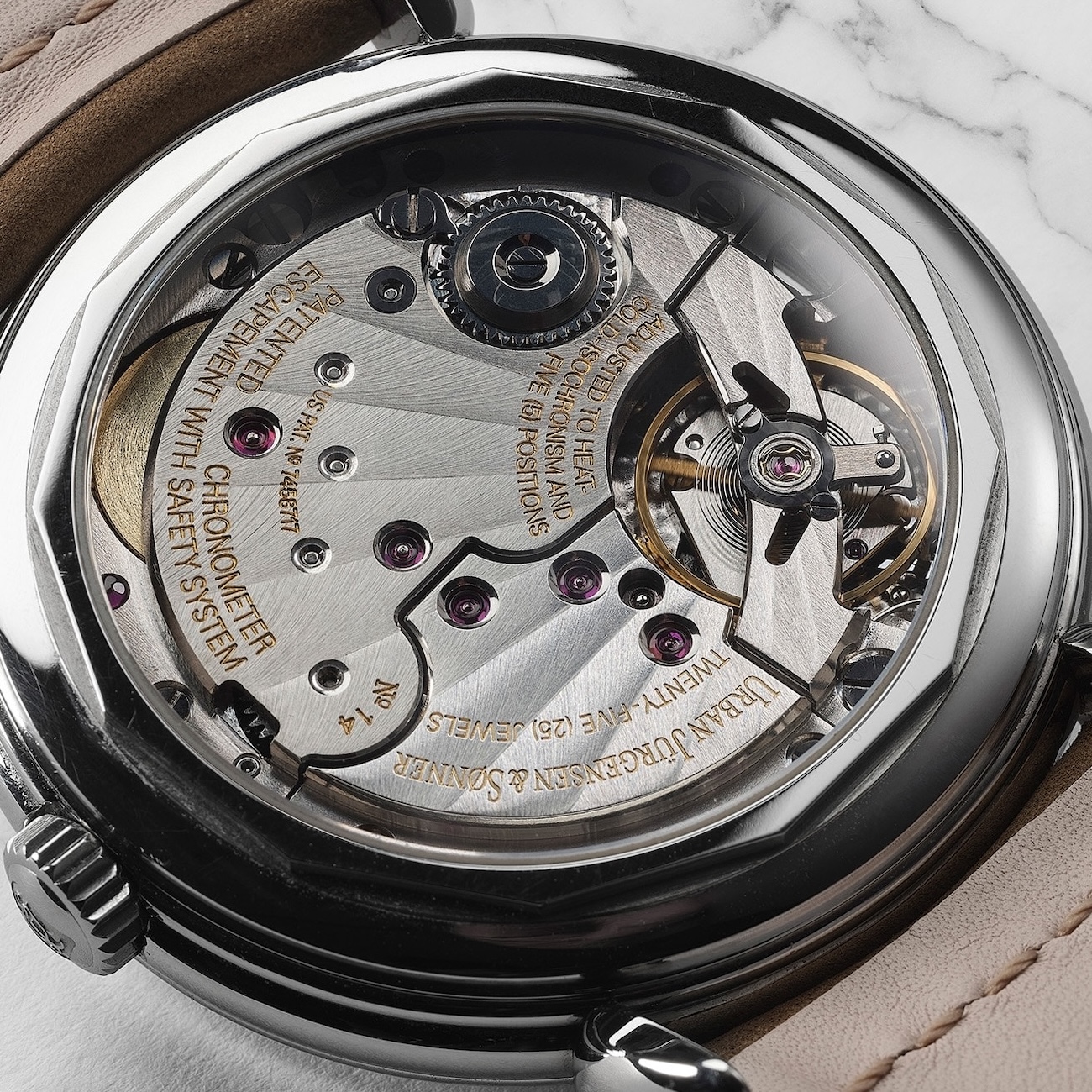 Pratt had a very clear idea when talking about a dedicated movement for UJ. Consdering the rich past of the brand, he wanted something in line with the tradition of Urban Jürgensen, meaning a precision timepiece with a chronometer escapement. Pratt, using a Unitas ébauche as a base, started in 2003 to work on incorporating a detent escapement, which prove difficult considering the needs for miniaturisation and the well-known issue of this type of escapement’s sensitivity to shocks. While the prototype was achieved by Pratt, serial production proved difficult and this called for the intervention of specialists in conception and industrialisation, and the development was placed in the hands of then-young engineer Jean-François Mojon, known today as the owner of Chronode – one of the top movement designers and manufacturers in Switerland.