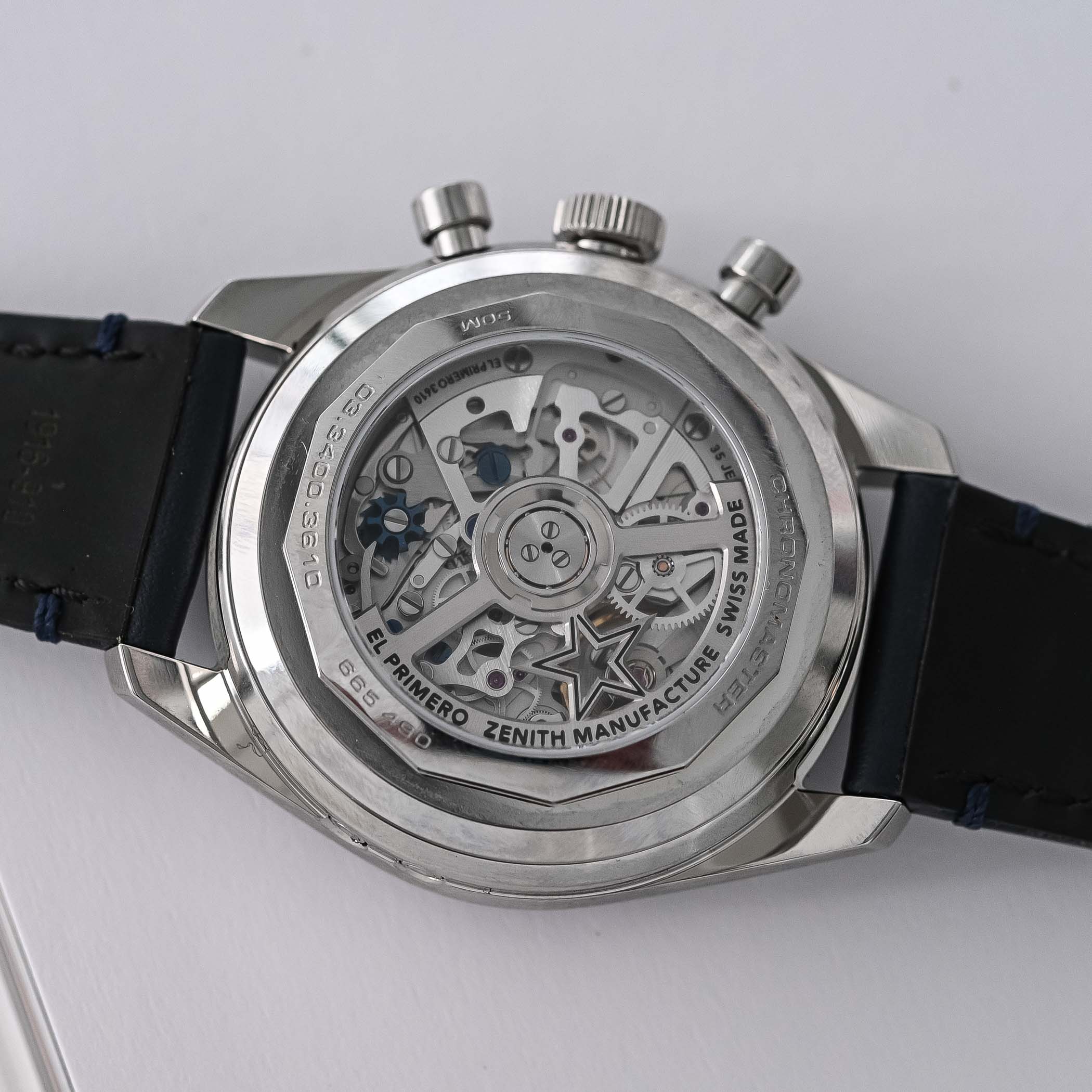 Inside is the El Primero 3610, an automatic column-wheel chronograph movement with a lateral clutch. It operates at 36,000 vibrations per hour (5 Hz), enabling high-frequency timing and the signature 1/10th-second chronograph functionality. It features a stop-seconds mechanism for precise time-setting and offers a 60-hour power reserve via a single barrel. Visible through the sapphire caseback, the movement includes Zenith’s star-shaped oscillating weight with a satin finish, though the overall decoration is restrained in keeping with the watch’s technical orientation.