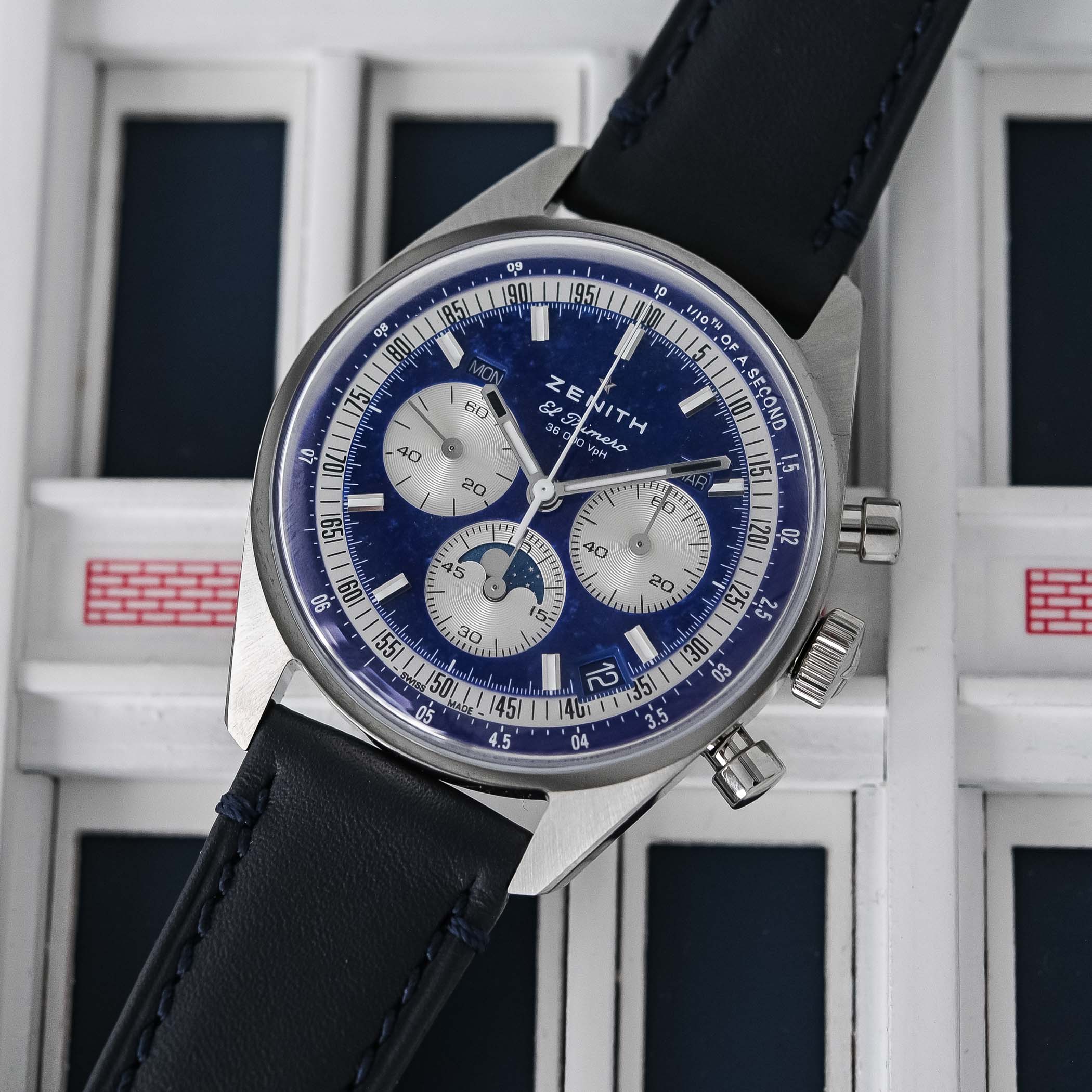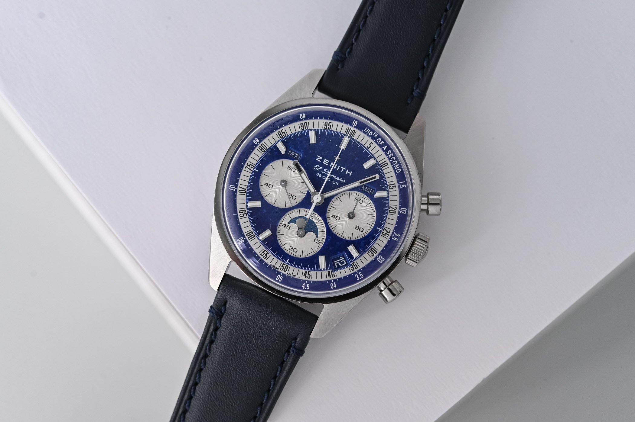 The lapis lazuli dial introduces a decorative element without compromising technical integrity. Using natural stone poses manufacturing challenges due to its brittleness and requires precise machining and structural reinforcement to ensure durability. In this configuration, the lapis base harmonises with silver-toned subdials and rhodium-plated, faceted markers and hands coated with SuperLuminova SLN C1 to preserve low-light legibility. The dial follows the tri-compax layout typical of the El Primero, with subdials at 3, 6, and 9 o’clock. At 3 o’clock is the chronograph seconds counter, while the 6 o’clock register combines a 60-minute chronograph totaliser with a moon-phase aperture. Running seconds are located at 9 o’clock, and the central chronograph hand makes one rotation every 10 seconds, enabling 1/10th-of-a-second resolution.
