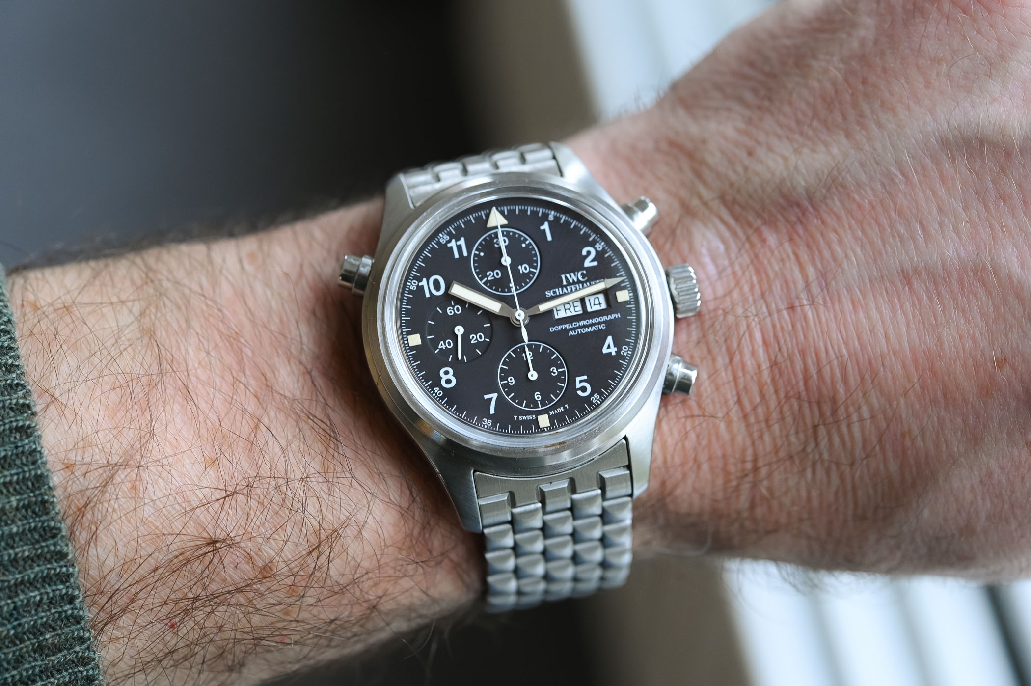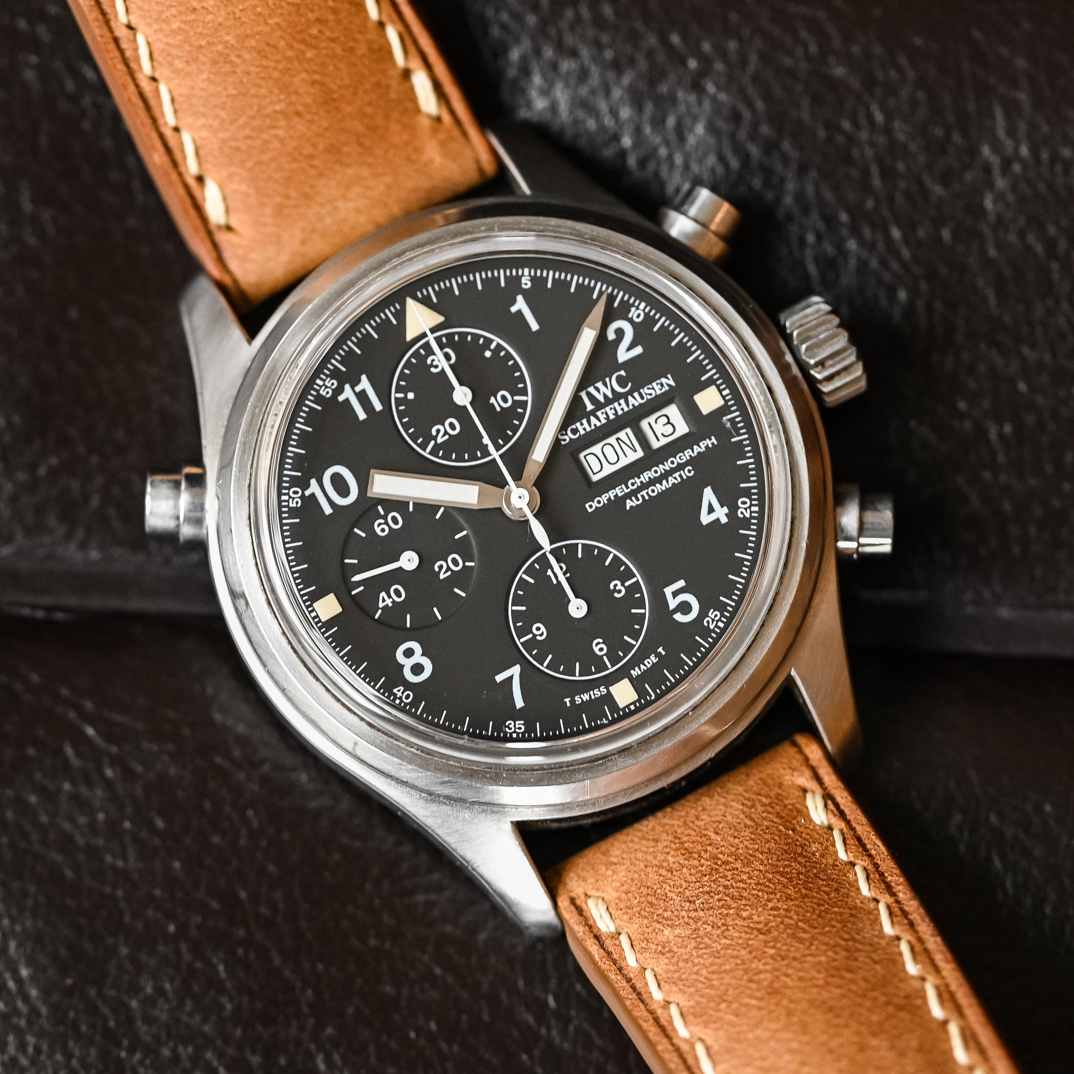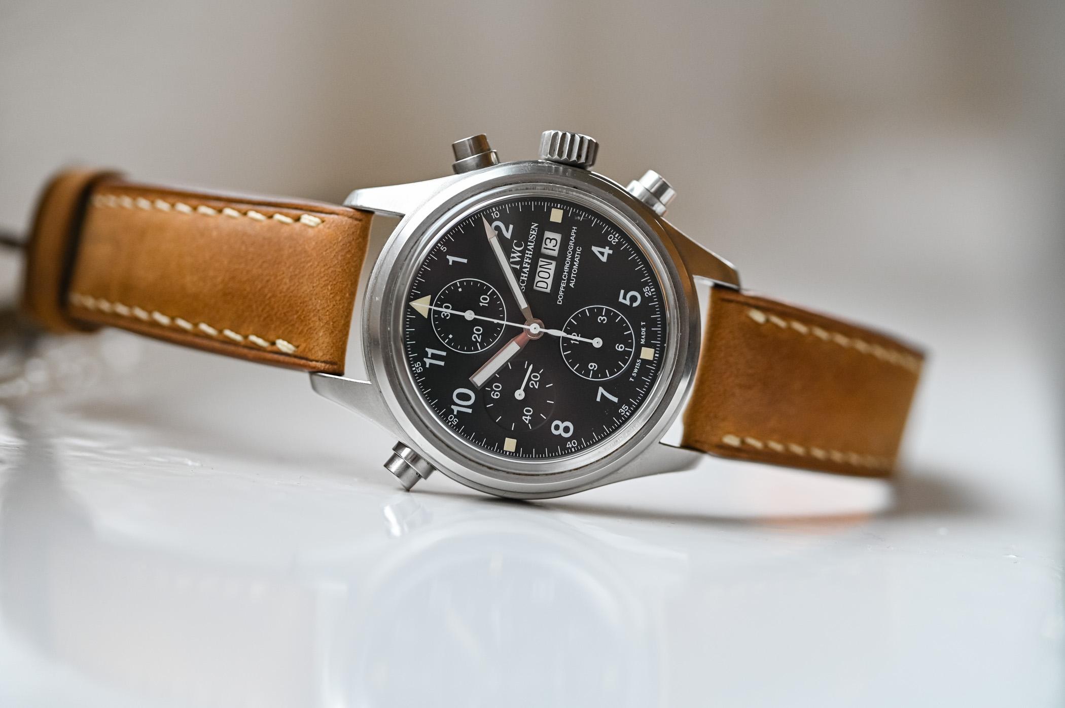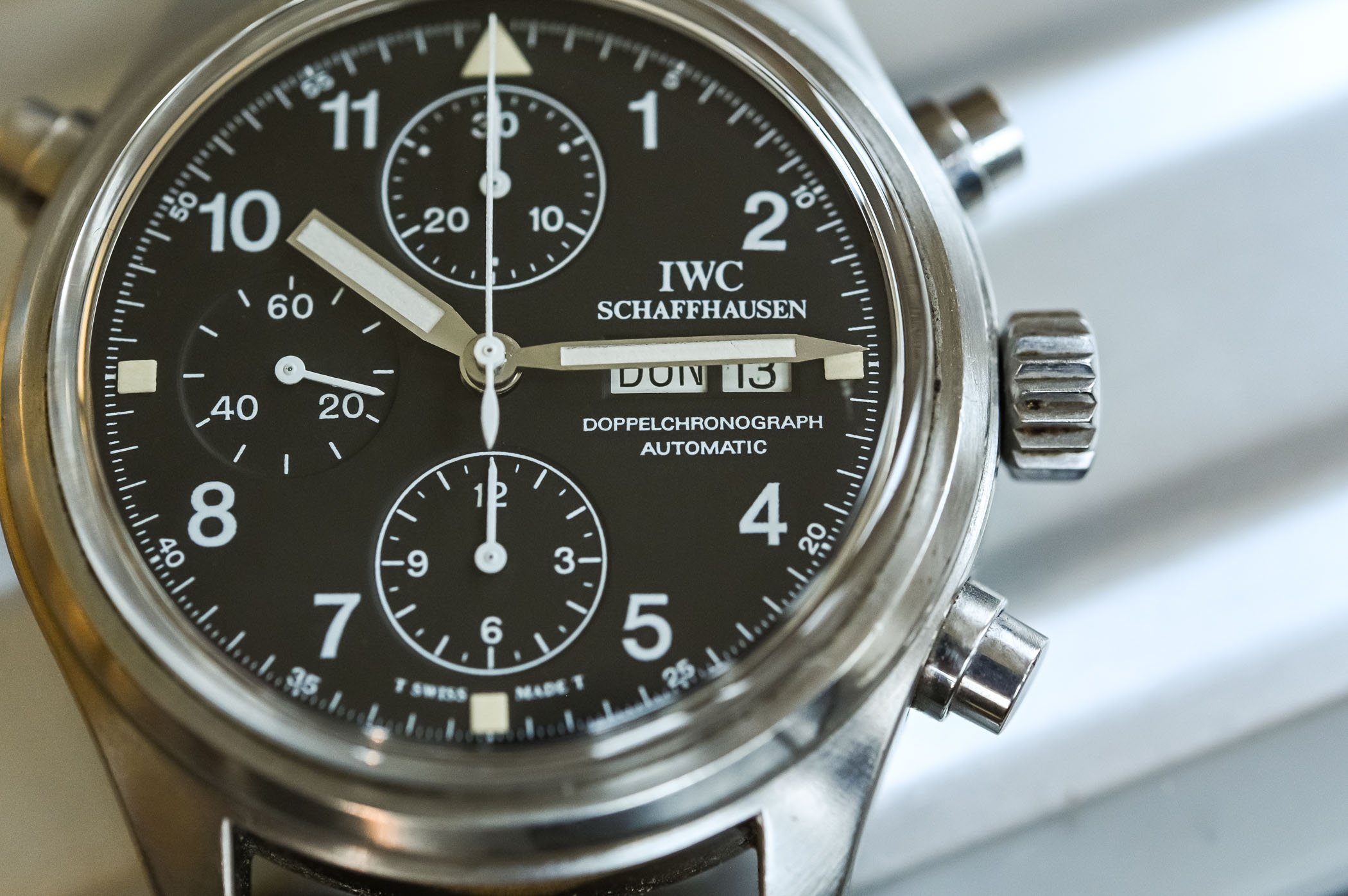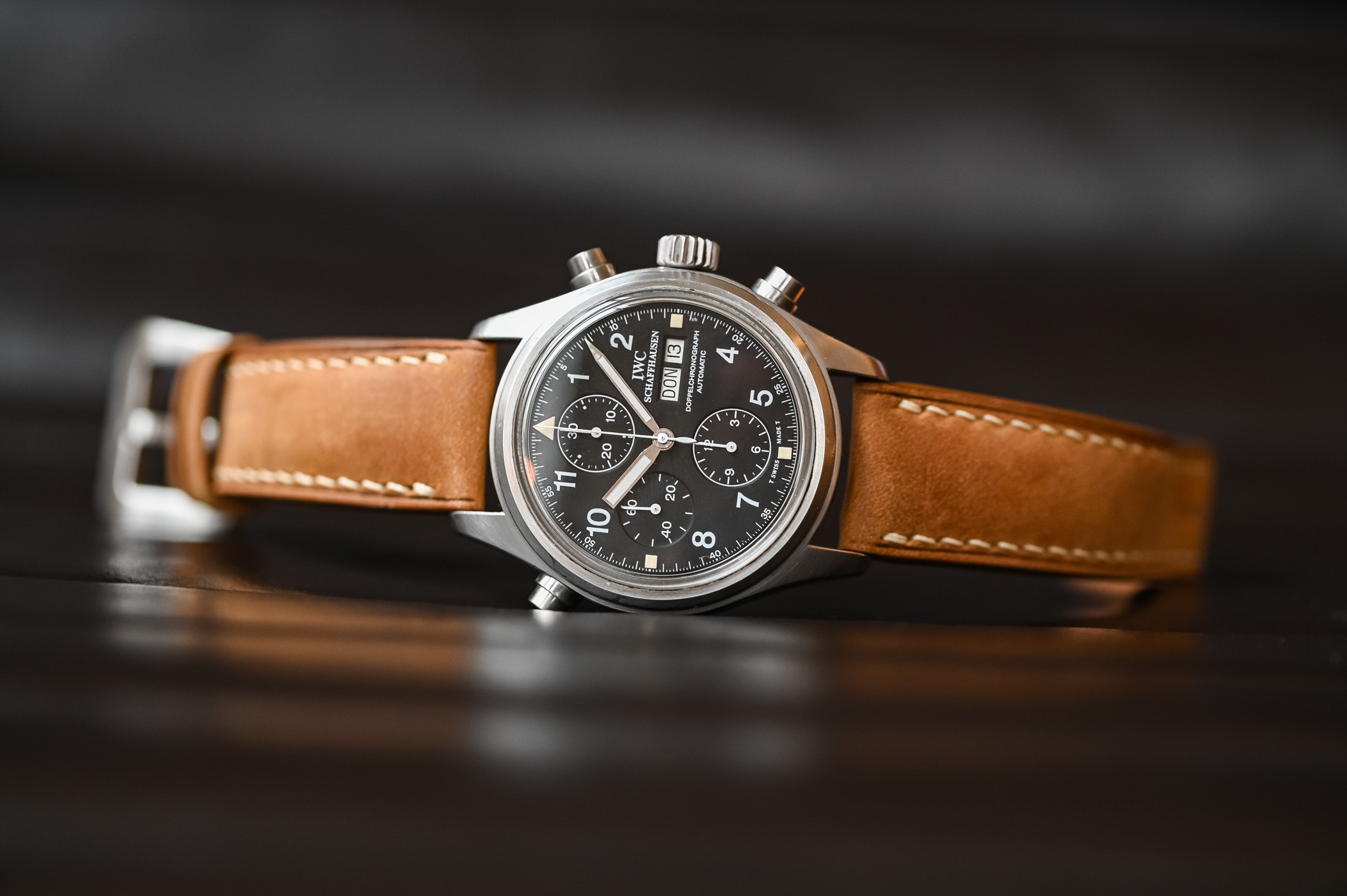 There’s something about these no-fuss, bang-them-up watches that speaks to me. Looking at the Doppelchronograph 3711, I get the same feeling as when I hold a well-loved Submariner 14060 or a Speedmaster Professional… or, taking the analogy away from the world of watches, like holding a pair of battered and worn Redwing boots. These watches take me back to the days when a watch was just a watch, an instrument for telling the time, not the safe queen, status symbols of the modern world. Granted, I wasn’t even alive to witness those days, but the sheer “utilitarian-ness” of the watch appeals to me at an emotional level that I can’t quite explain! You look down at the dial of the Doppelchronograph and you’re struck by the sheer legibility of it. White printing on a matte black base makes for incredible contrast – the day and date are reversed: once again, legibility is the name of the game! It also has to be said that the Doppelchronograph is instantly recognizable as an IWC – even though IWC was not alone in manufacturing the first Flieger watches, it is the company people automatically associate with the look.