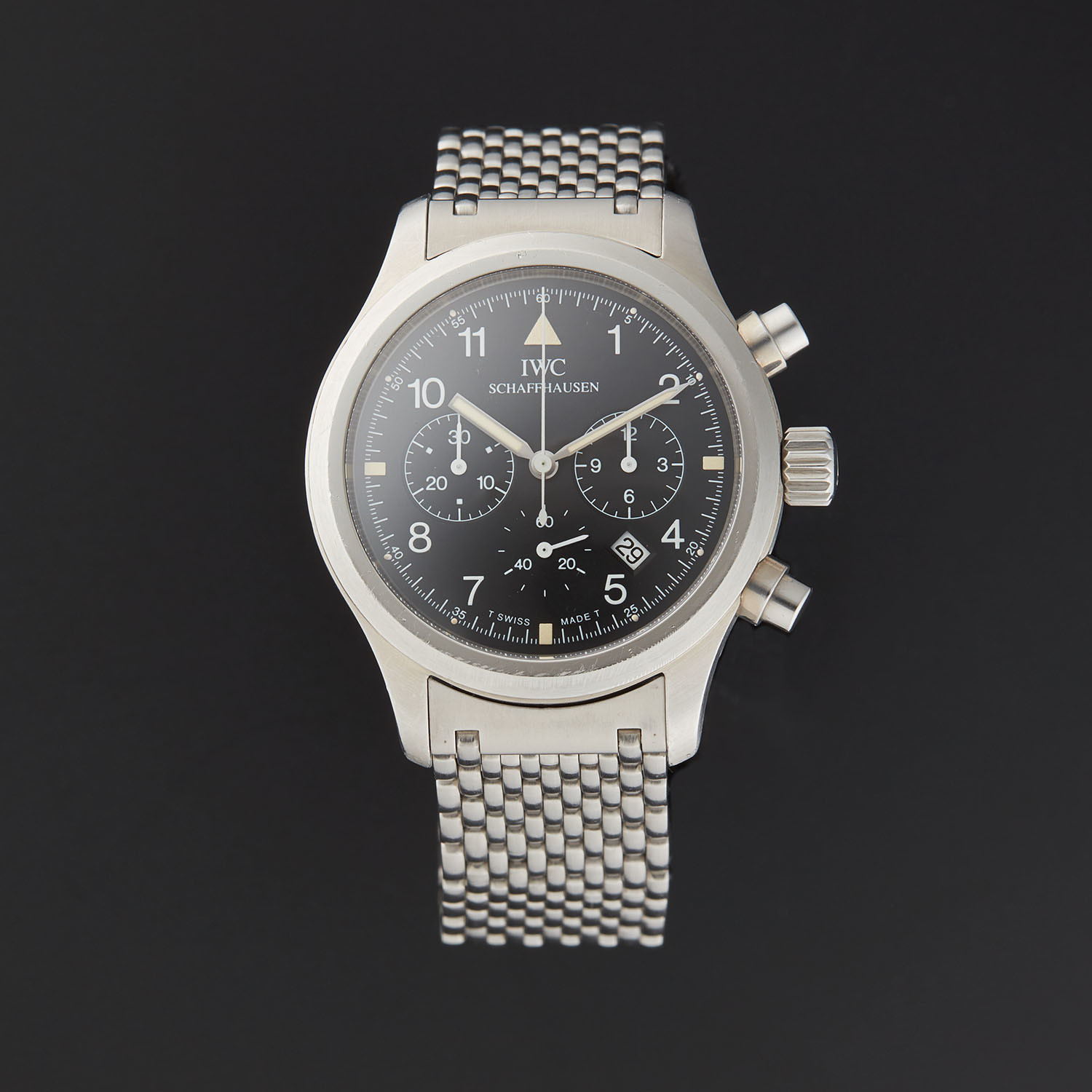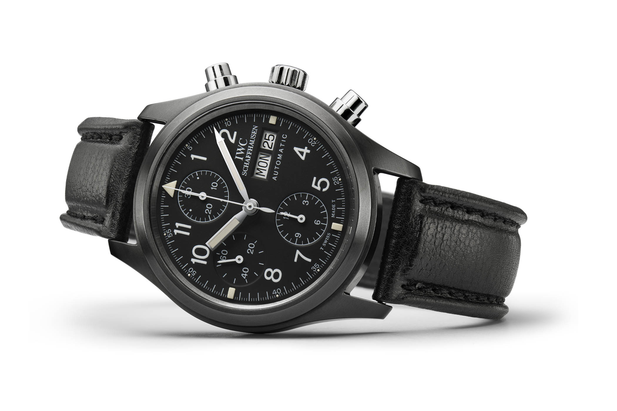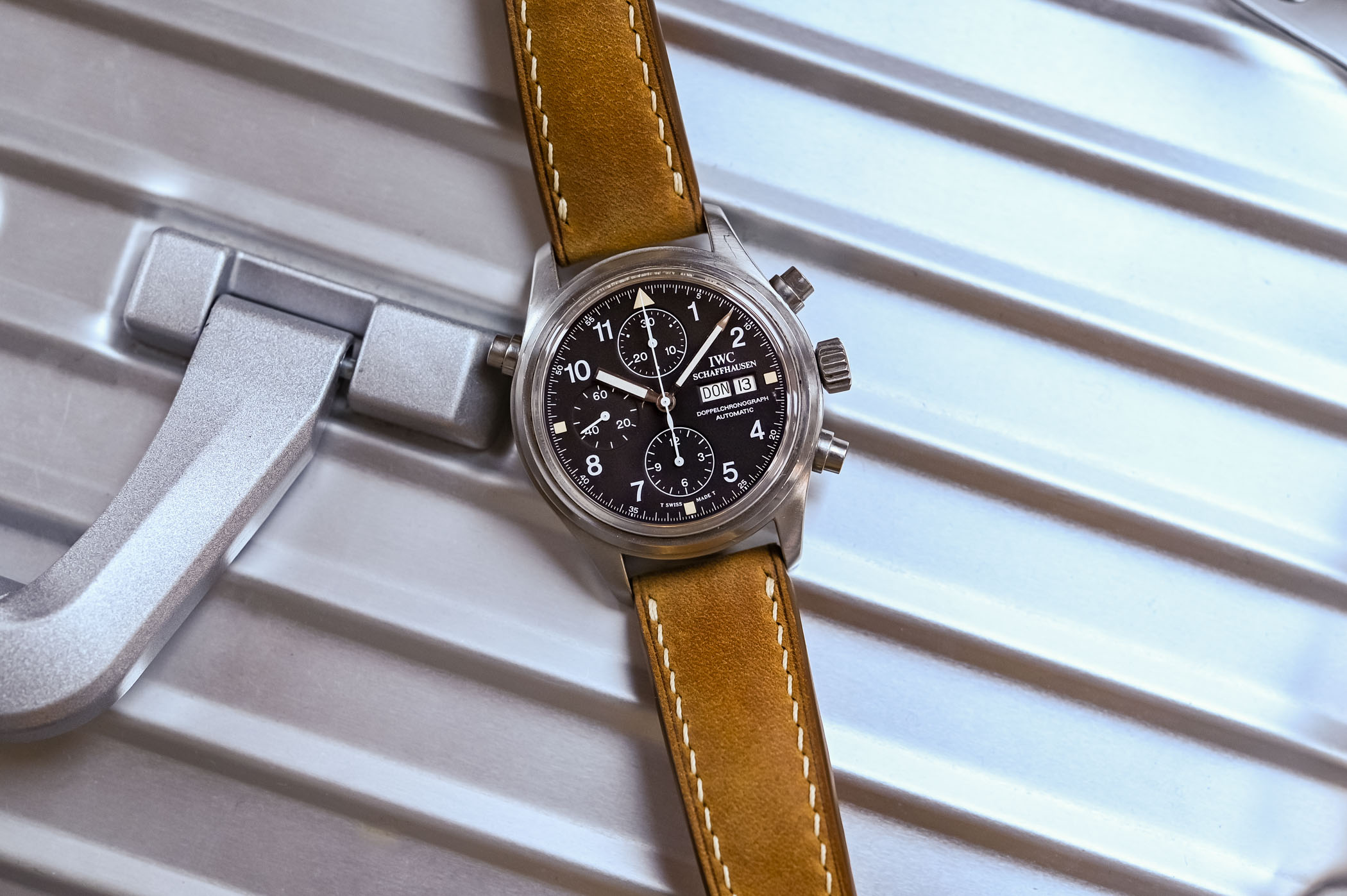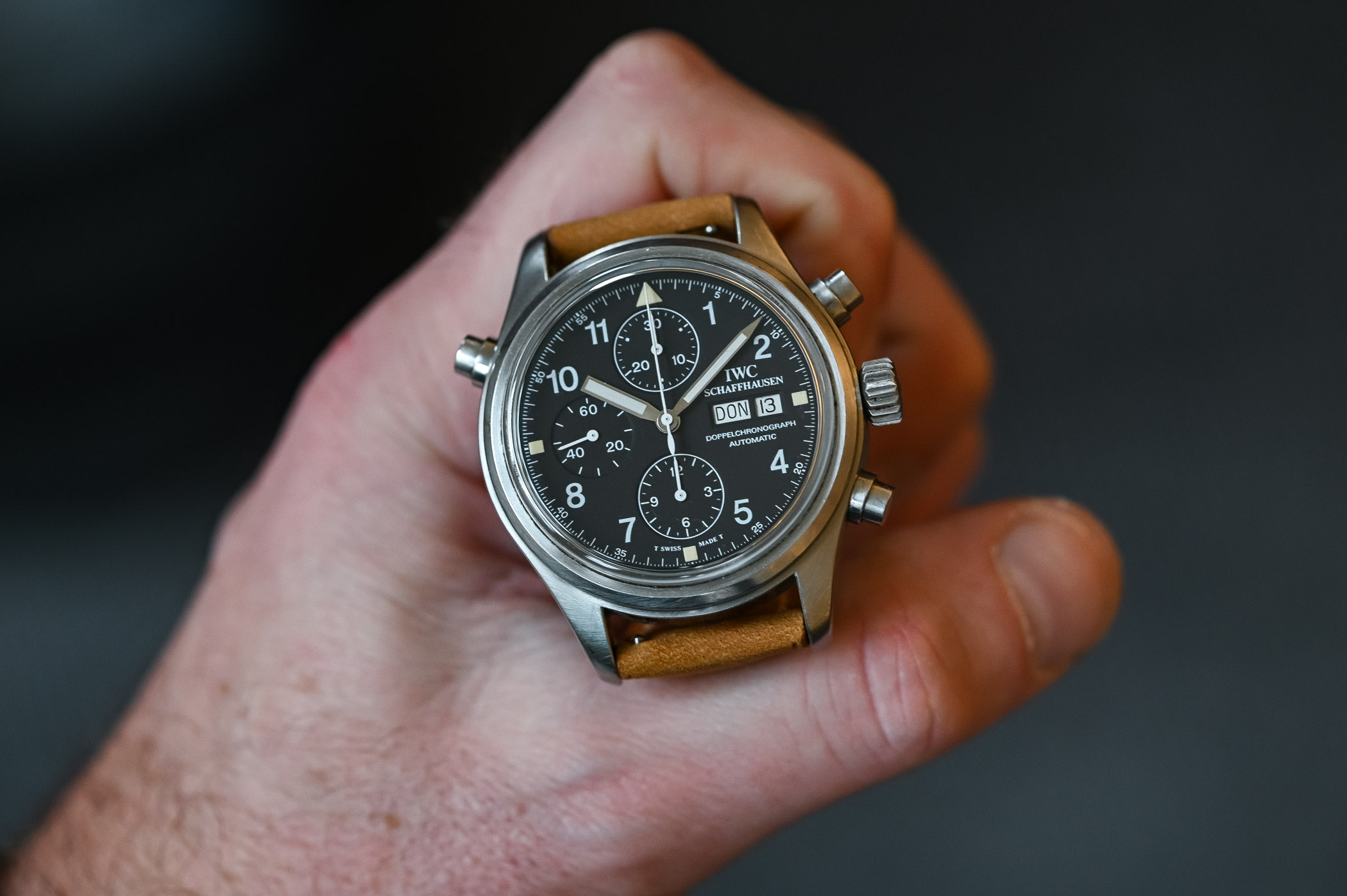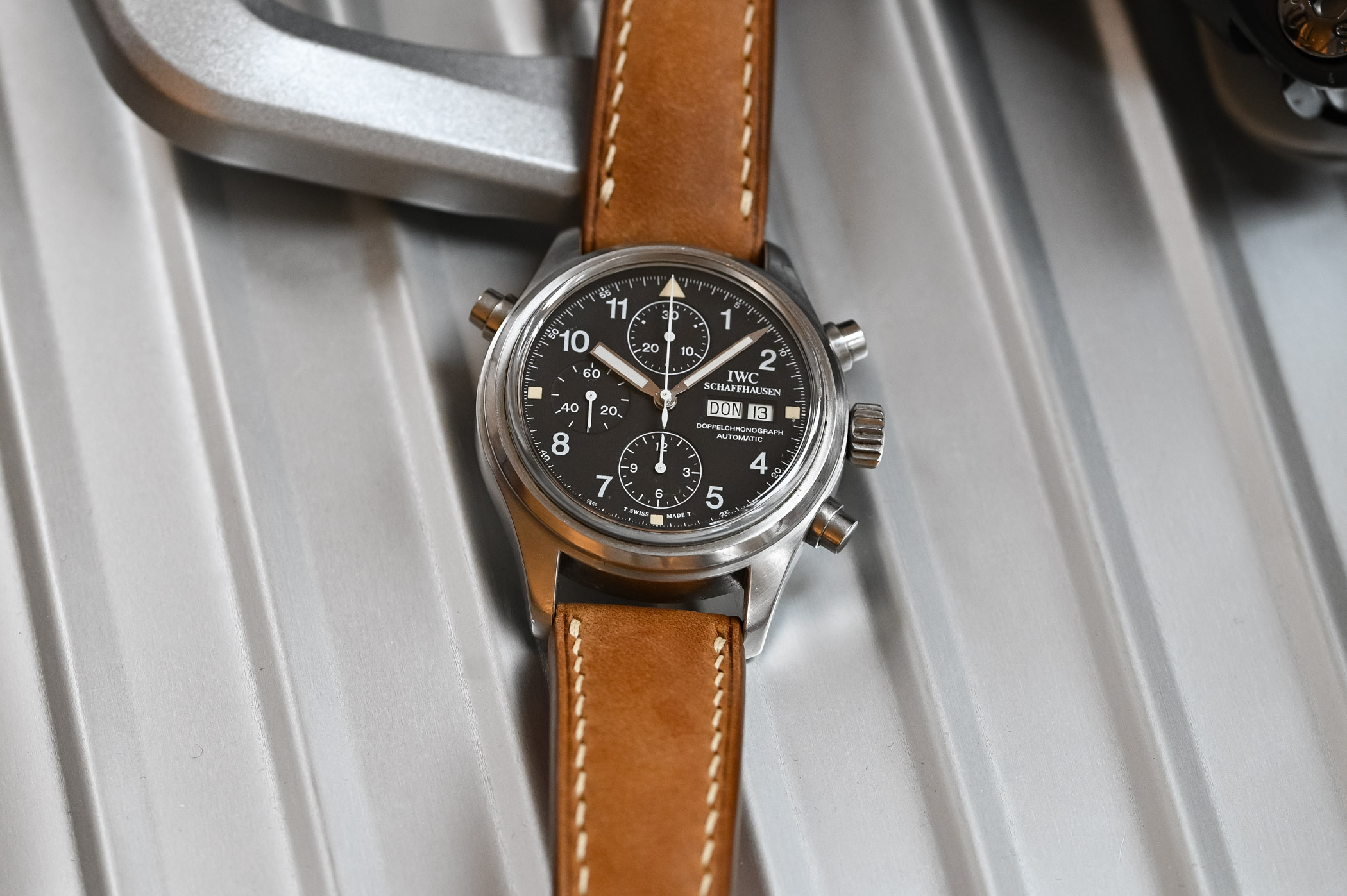 There’s something about these no-fuss, bang-them-up watches that speaks to me. Looking at the Doppelchronograph 3711, I get the same feeling as when I hold a well-loved Submariner 14060 or a Speedmaster Professional… or, taking the analogy away from the world of watches, like holding a pair of battered and worn Redwing boots. These watches take me back to the days when a watch was just a watch, an instrument for telling the time, not the safe queen, status symbols of the modern world. Granted, I wasn’t even alive to witness those days, but the sheer “utilitarian-ness” of the watch appeals to me at an emotional level that I can’t quite explain! You look down at the dial of the Doppelchronograph and you’re struck by the sheer legibility of it. White printing on a matte black base makes for incredible contrast – the day and date are reversed: once again, legibility is the name of the game! It also has to be said that the Doppelchronograph is instantly recognizable as an IWC – even though IWC was not alone in manufacturing the first Flieger watches, it is the company people automatically associate with the look.
