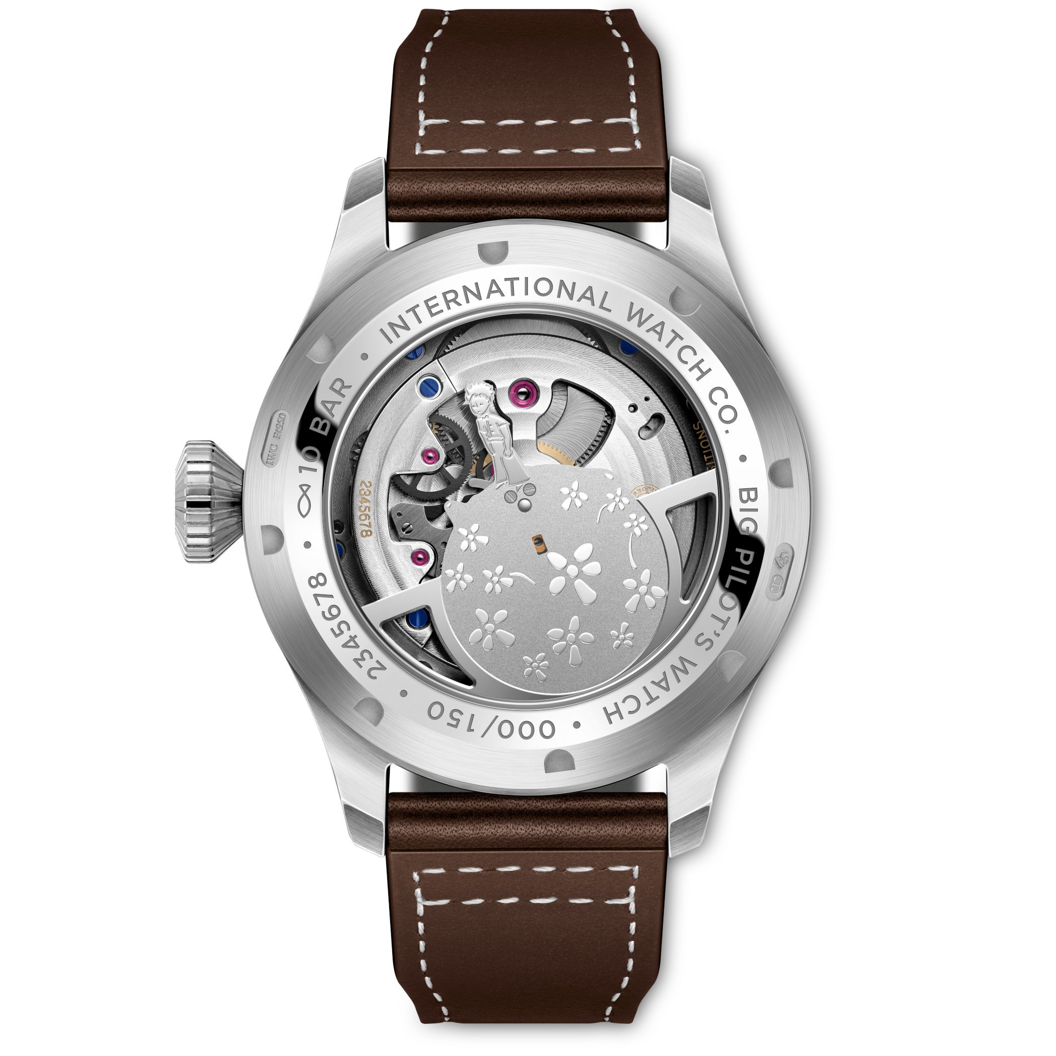A large aperture on the dial reveals the flying one-minute tourbillon. Composed of 56 parts and weighing only 0.635 grams, the tourbillon can be stopped to set the time accurately. Visible on the caseback is the IWC 82905 calibre with Pellaton winding, a 4Hz frequency and a robust power reserve of 80 hours. As a special edition, the Prince appears on asteroid B 612 surrounded by exotic baobab trees.